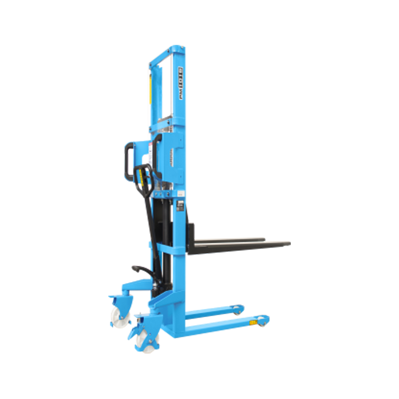A empilhadeira manual PM1016 opera exclusivamente em paletes abertos. É ideal para descarga leve de pick-ups e caminhões. A elevação do garfo é feita através do acionamento da alavanca de comando e/ou do pedal que bombeia o óleo hidráulico para dentro do conjunto e movimenta o pistão interno de elevação. O abaixamento do garfo é feito por acionamento manual do gatilho localizado no timão de comando.